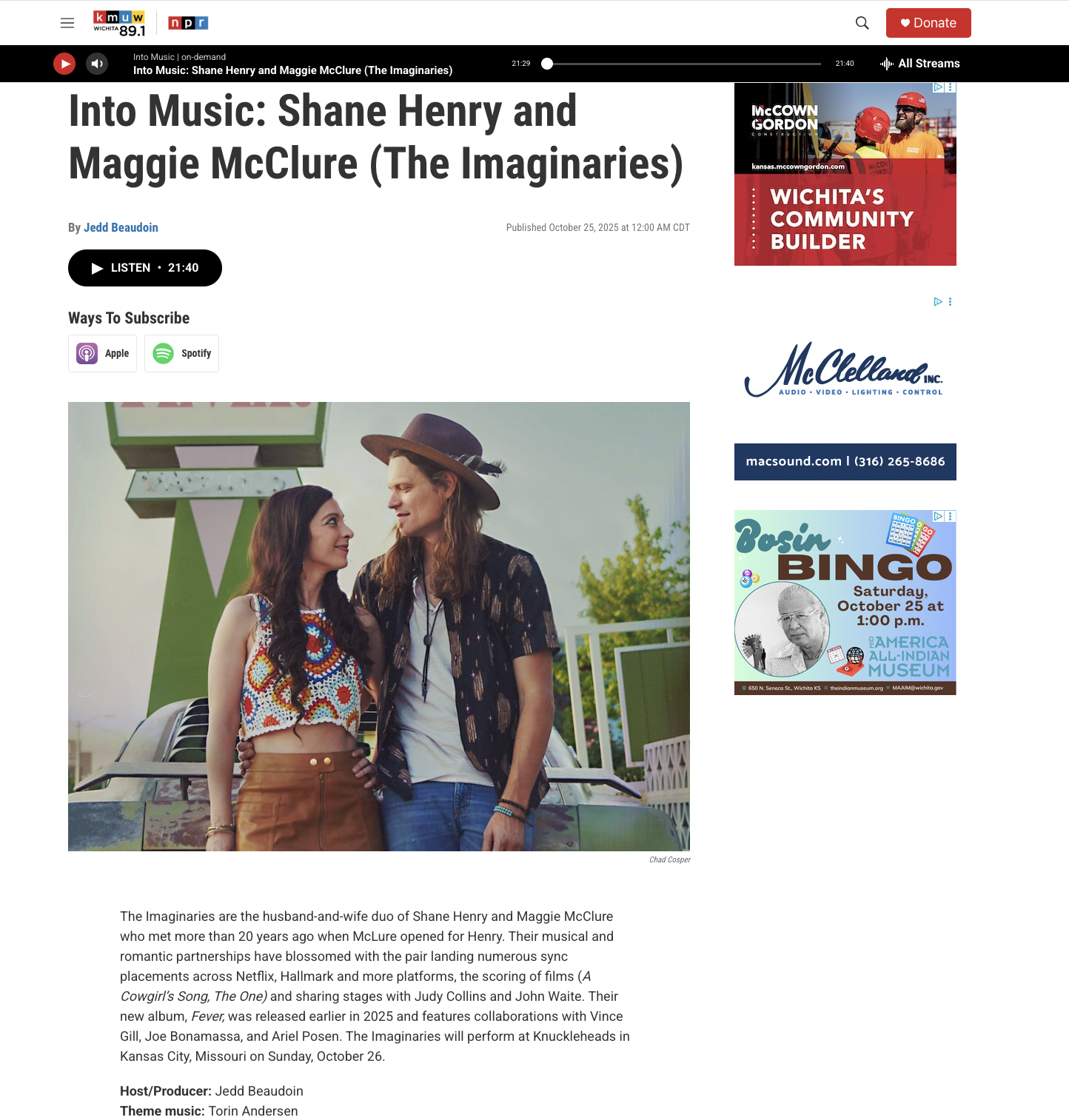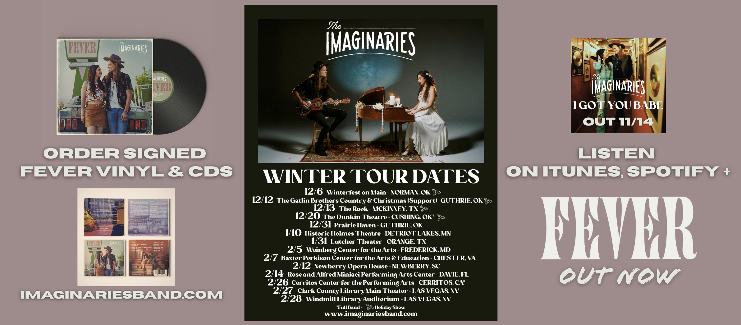 Maggie and Shane are born and raised, proud Oklahomans. Maggie is from the large city of Norman, and Shane is from the tiny, 700-person town of Verden. Both wield impressive solo artist resumes with prime song placements, critically-acclaimed solo albums, acting appearances, and landmark live performances. Their artistic union was cemented in 2018 when Maggie and Shane were invited to perform as a duo in Muscle Shoals, Alabama on Grammy-winning engineer John Cuniberti’s (Train, Aerosmith, PJ Harvey) YouTube program, “The OneMic Series.” Since then, Muscle Shoals has become something of a sacred place for The Imaginaries, and they tracked both of their albums there with the studio’s legendary session musicians, The Swampers (1st and 2nd generation). Look for The Imaginaries on tour in 2025 and beyond.
